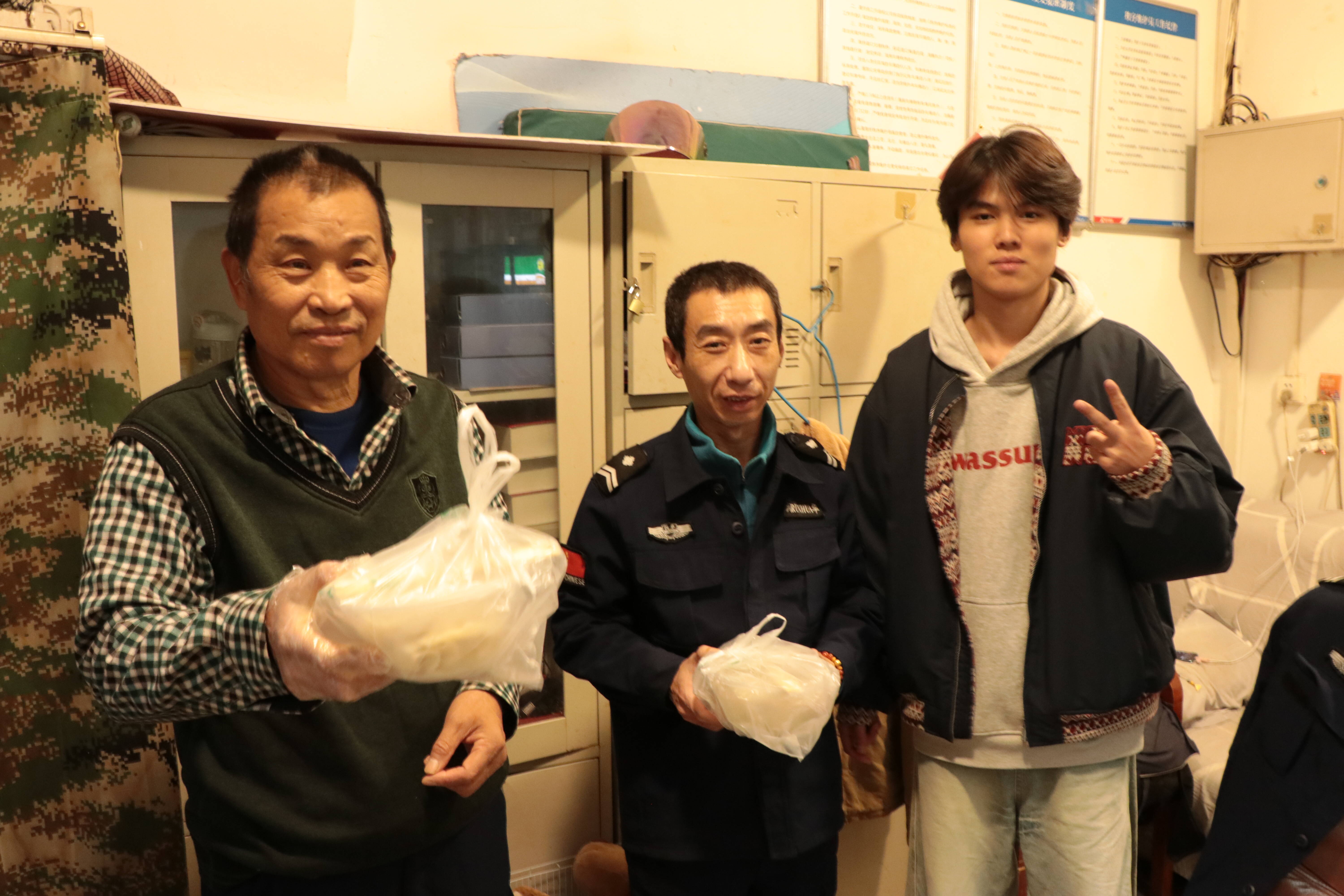 随后,一盘盘热气腾腾的饺子被精心打包好,走向宿舍值班室和校门口保安亭等工作场所。大家将这份带着温度的心意,亲手递到宿管阿姨和保安师傅手中。工作人员们接过饺子,脸上瞬间绽放出欣慰而温暖的笑容,连连道谢,眼中满是感动。