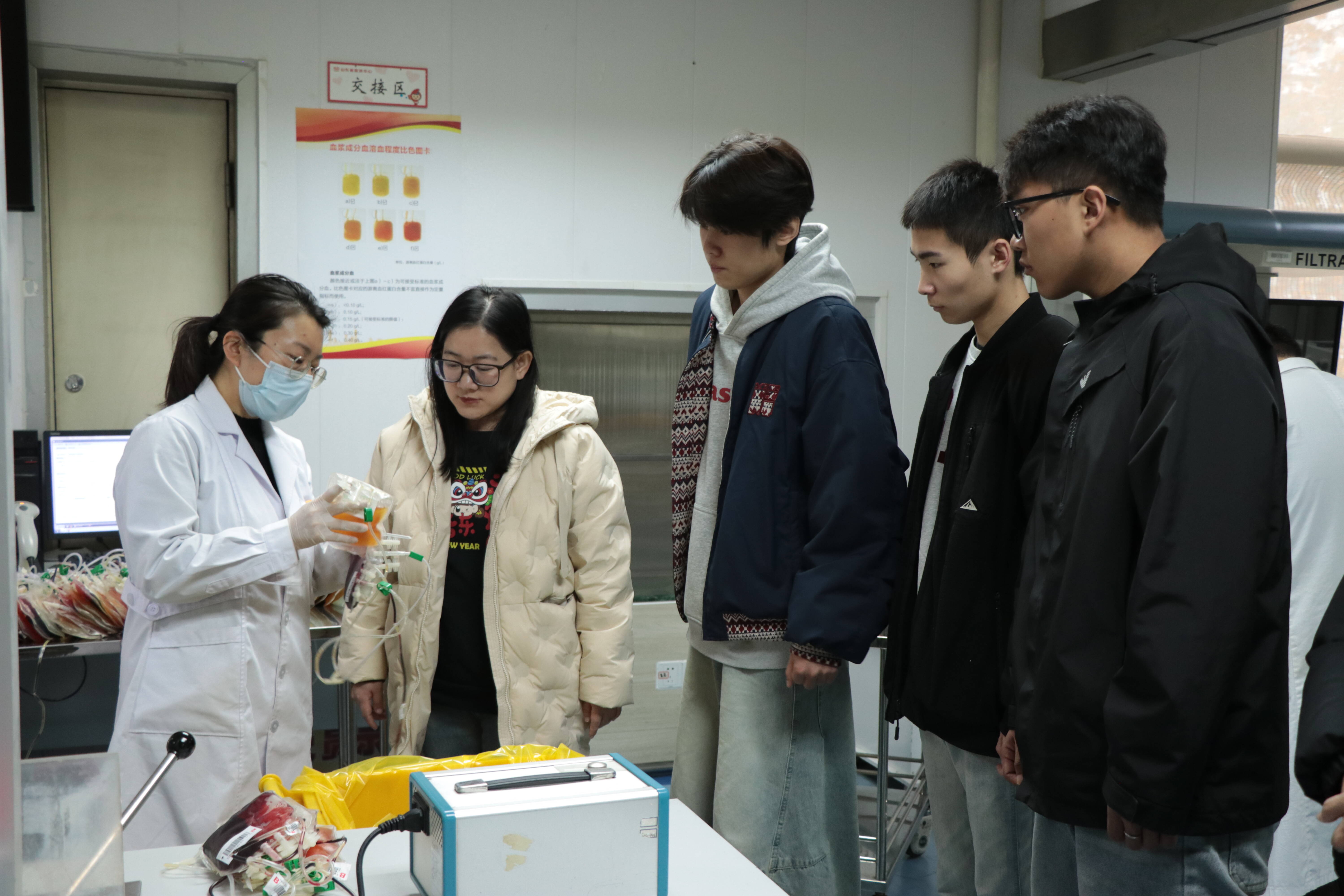 会后,与会师生共同参观了血液中心。各科室负责人结合岗位实践细致讲解,清晰呈现了血液从采集入库、成分分离、严格检验到低温储存、最终精准配送至临床的全链条流程,揭秘了无偿献血背后的专业坚守与暖心故事,参观人员深受感动和鼓舞。