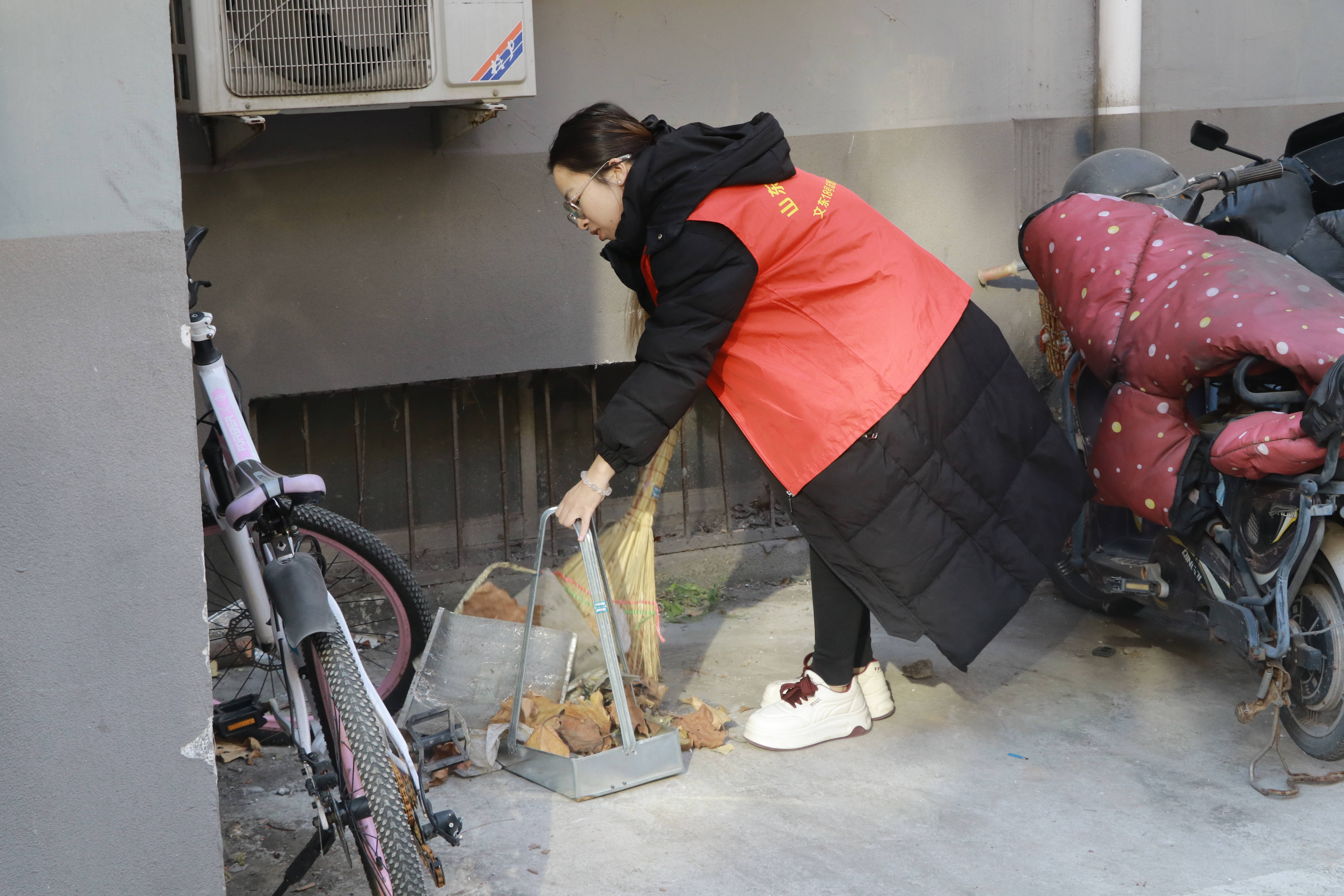 活动现场,志愿服务队成员与新入团团员迅速组队,默契配合,手持扫帚、垃圾袋等工具,对社区主干道、居民楼周边及休闲广场的落叶进行了全面清理。大家分工明确、互帮互助,积极投入劳动,认真清理角落缝隙中的落叶,以高效协作的实际行动,让社区环境焕然一新。