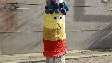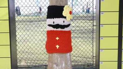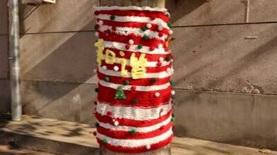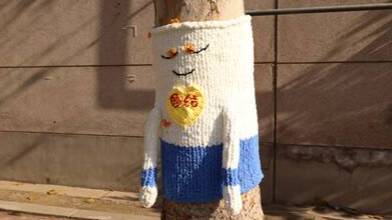 同学们用钩针和毛线为树干量身制作创意“外套”,这些“树衣”造型各异,有的扮成小卫士,有的缀着蝴蝶结,有的织有“团结”“友爱”字样并搭配向日葵花束,色彩鲜亮的它们让光秃秃的树干成了街头网红打卡点。