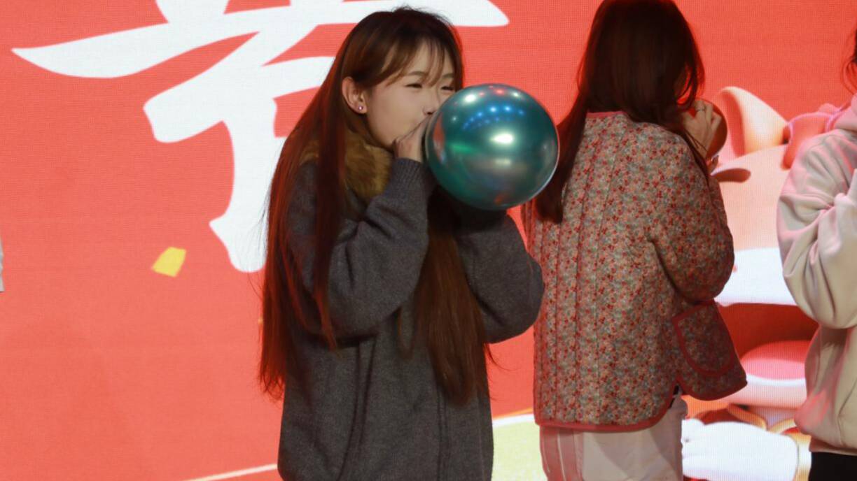 吹气球互动环节点燃观众参与热情,参与者鼓足气力比拼,脸颊涨红奋力吹气,率先吹爆气球的六位观众收获精美奖品,现场欢笑声、呐喊声交织,晚会氛围推向新顶点。