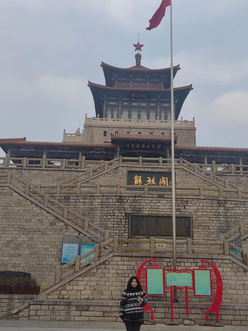 当我怀着无比崇敬与虔诚之心,缓缓踏入解放阁的那一刻,时光的闸门仿佛轰然洞开,我瞬间穿越到了那个战火纷飞、硝烟弥漫的峥嵘岁月。解放阁静静矗立,宛如一位沉默而坚毅的历史见证者,它身上每一道斑驳的痕迹,都镌刻着济南解放那段波澜壮阔、气壮山河的壮烈史诗。我仿佛看到先辈们如猛虎般无畏冲锋,听到他们震天动地的呐喊,感受到他们舍生忘死、义无反顾的坚定信念。作为新时代的高校学生,我定当铭记历史,勇担时代使命,让红色基因融入血脉,在奋斗中绽放青春光彩。